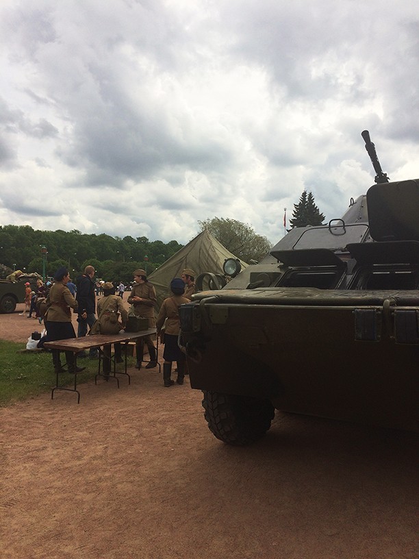 Я была на Марсовом поле около часа дня – тщательно охраняемый правоохранителями парк был наполнен семьями с детьми, стариками, прогуливающейся молодежью. Все они участвовали в развлекательных и познавательных мероприятиях от военно-патриотической организации «Красная звезда». Там можно было посидеть на танке, отведать пару блюд на полевой кухне, пострелять из автомата и послушать народные песни. Детей учили основам рукопашного боя, аниматоры развлекали их песнями и танцами, кто-то из них сдавал армейские нормативы и постигал азы рыцарства. Все было тихо и спокойно – атмосфера была чудесная.