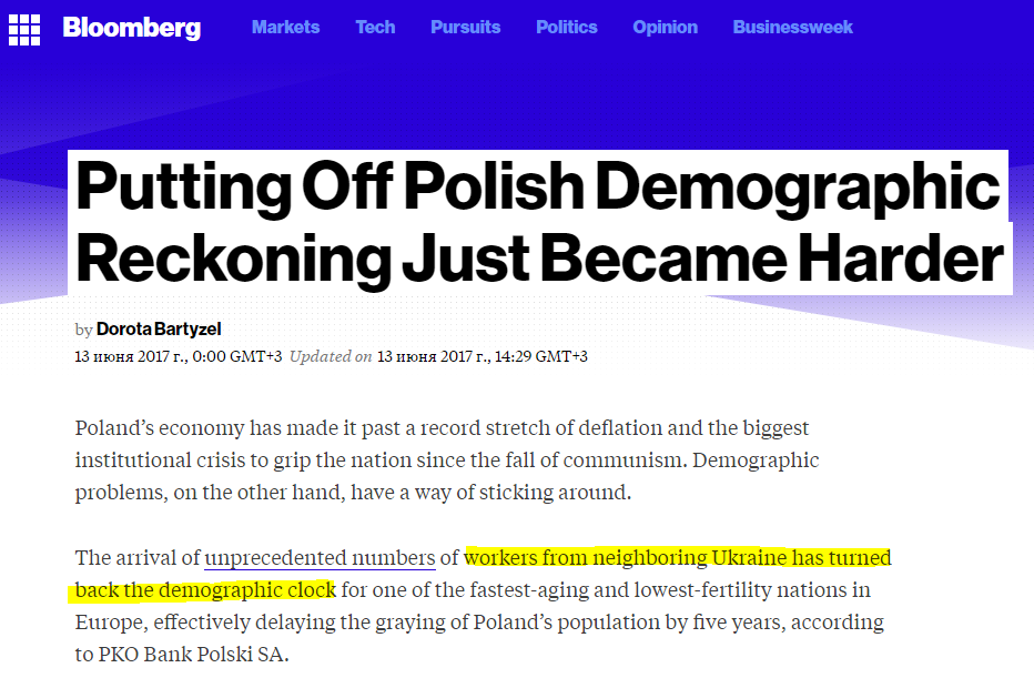 В то же время, по ту сторону кордона весело хлопают в ладоши — радостный Bloomberg сообщает, что за счет украинцев Польша не только приостановит свои «демографические часы», но и заполнит бреши в своей экономике.