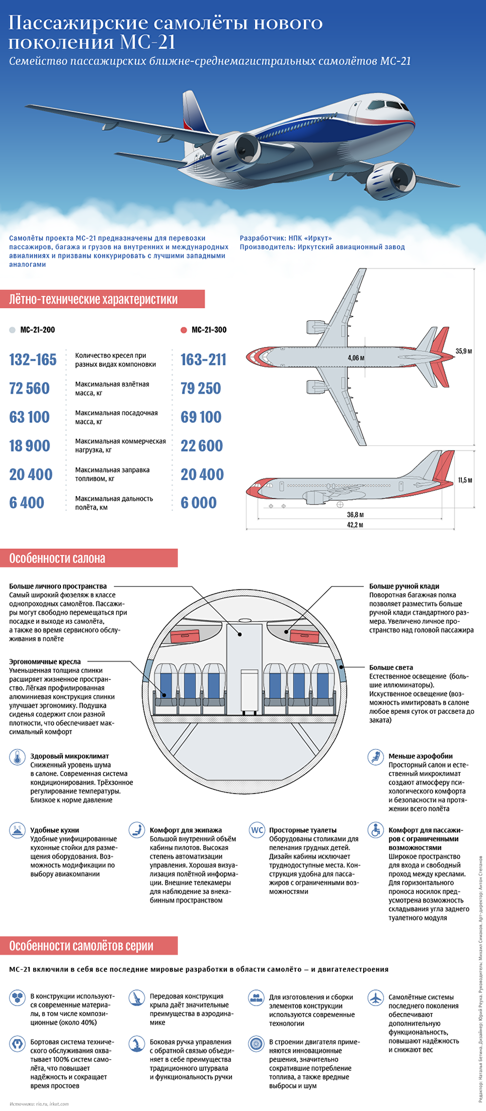 МС-21 — пассажирский самолет вместимостью от 150 до 211 пассажиров, включает в себя новейшие разработки в области самолето- и двигателестроения, бортового оборудования и систем. Он сменит советские самолеты "Ту", "Як" и "Ан".