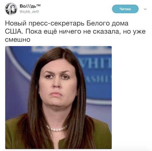 Честно говоря, с «лицами» у американцев в последнее время, как бы сказать помягче, не очень… Так, Шон Спейсер, которого сменила Сара Сандерс, за полгода нахождения на посту показал себя не с лучшей стороны: вступал в перебранки с журналистами, путал имена политиков, позволял себе нетактичные шутки, допускал ляпы.