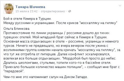 "В одном из отелей Кемера полиции пришлось разнимать российских и украинских туристов, которые устроили драку. Как утверждают очевидцы, пьяные реплики отдыхающих с Украины в отношении курортников из России стали причиной массового побоища",- писшет Сегодня.ру.