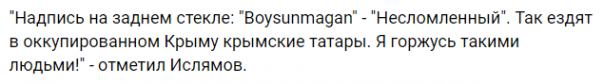 Теперь же невероятный восторг и гордость среди украинцев вызвал «поступок» крымского татарина в Крыму, который ездит на личном автомобиле с надписью на заднем стекле «Boysunmagan», что переводится как «Несломленный». В социальных сетях отметили «небывалую отвагу» мужчины.