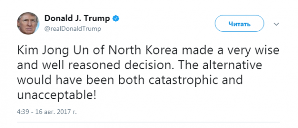 "Ким Чен Ын принял обоснованное и очень мудрое решение. Альтернатива была бы катастрофической и неприемлемой!" − написал глава Соединённых Штатов в Twitter.