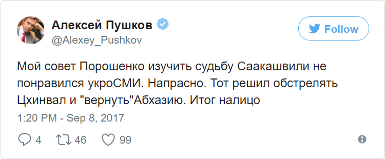 Сенатор Алексей Пушков сделал президенту Украины Петру Порошенко предупреждение: громкие заявления украинского лидера чреваты для него повторением судьбы Михаила Саакашвили.