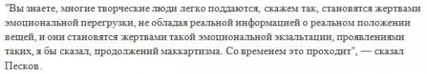 Пресс-секретарь президента РФ Дмитрий Песков назвал Фримена «жертвой эмоциональной перегрузки», так как актеру, по его мнению, не хватает реальной информации о реальных событиях, происходящих в мире, из-за чего он стал «жертвой эмоциональной экзальтации». Но Песков тут же добавил, что со временем это проходит.
