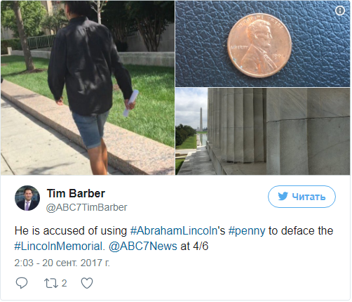 В Вашингтоне задержали 21-летнего гражданина Киргизии по подозрению в вандализме. Молодой человек нацарапал монетой свое имя на мемориале Авраама Линкольна.