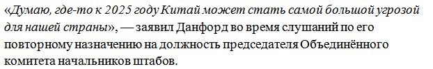 При этом генерал подчеркивает, что РФ якобы остаётся большой угрозой из-за военной мощи и ядерного потенциала. Однако если брать в расчёт демографическую и экономическую ситуацию, то опасность представляет однозначно КНР. По мнению Данфорда, Пекин стремится к ограничению возможности США распространять влияние и ослаблению и союзов в Тихоокеанском регионе.