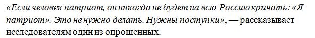 Он также добавил, что патриотизм в понимании молодежи должен демонстрироваться не вербальным путем, а участием в знаковых проектах, которые оказывают положительное влияние на будущее России. Студентам свойственно восприятие патриотизма сквозь призму деталей — участие в добровольческом движении и принадлежность к какому-то сообществу.