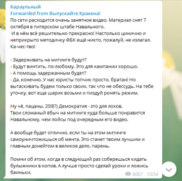 На сегодняшний день на просторах интернет паутины весьма активно распространяется интересный видео-материал: на прошлой неделе в петербургском штабе Навального был записан разговор сотрудника данного заведения с одним из волонтёров. Молодой человек поинтересовался у одного из организаторов несанкционированного митинга о том, как будет происходить данное действо (речь идёт о беспределах 7 октября).
