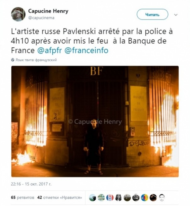 На опубликованном ею фото видно, что в Париже Павленский решил провести очередную «акцию»: он поджег двери Банка Франции.