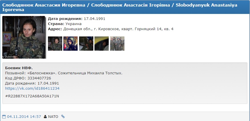 На сайте "Миротворец" она была указана как сожительница Михаила Толстых, более известного как "Гиви".