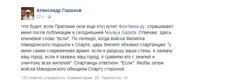 На фоне трёх этих громких скандалов и ещё нескольких потише, «Новая газета» выпустила материал о возможной продаже издания. В ответ главред «Фонтанки» Александр Горшков опубликовал довольно странный пост на своей страничке в facebook, пересказав на свой лад легенду о Филиппе Македонском.