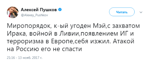 Реакция российского правительства тоже не заставила себя ждать. Сенатор Алексей Пушков прокомментировал в своем Twiiter сказанное Мэй.