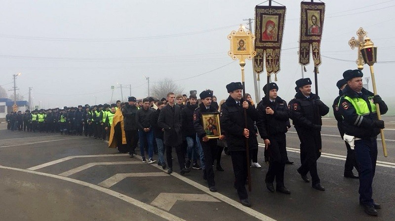 Около ста сотрудников ГИБДД прошли крестным ходом по опасному участку трассы в Краснодаре. Шествие было приурочено к Всемирному дню памяти жертв ДТП, сообщается на сайте Кубанской митрополии в субботу. Крестный ход прошел по благословению митрополита Екатеринодарского и Кубанского Исидора на аварийном участке автодороги Темрюк–Краснодар. Шествие проходило под звон колоколов передвижной звонницы. Возглавил его настоятель храма преподобного Сергия Радонежского протоиерей Богдан Черных. Участие в нем приняли также начальник краевого УГИБДД Александр Капустин, сотрудники Госавтоинспекции и ДПС и прихожане. Ну все, теперь я за кубанских водителей спокоен. Наконец-то руководство краевого УГИБДД разработало по-настоящему эффективные меры профилактики безопасности дорожного движения. А то разрабатываем всякие там регламенты, ужесточаем правила, усиливаем контроль, проводим всевозможные профилактические мероприятия для граждан, участников дорожного движения, а на дела все оказывается гораздо проще. С нетерпением жду, когда сотрудники патрульно-постовой службы Краснодарского края пройдут крестным ходом по самым криминогенным районам кубанской столицы. До новых, волнующих встреч!