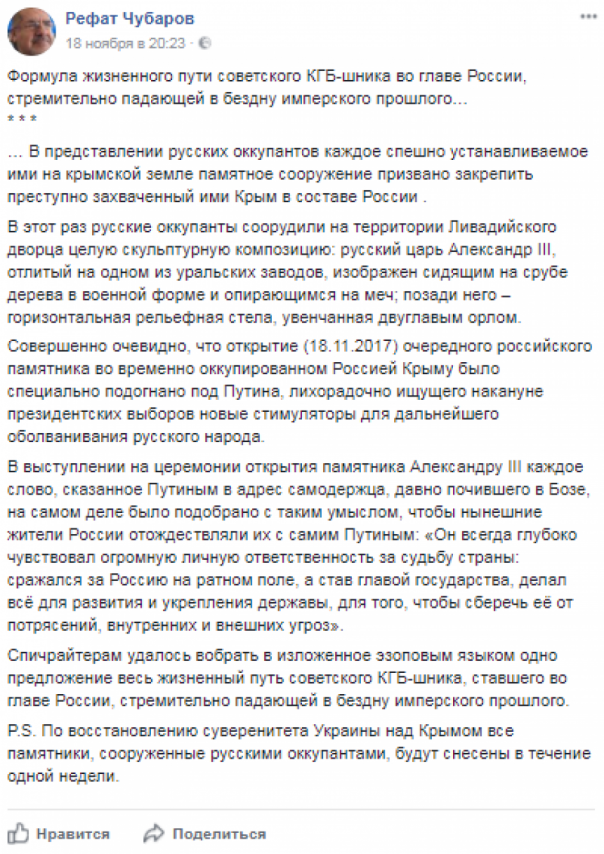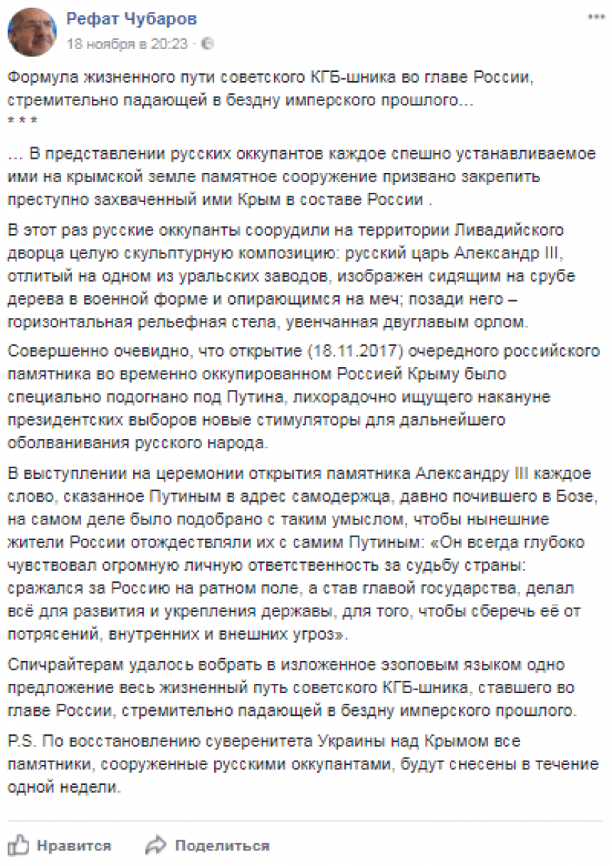 Глава запрещенного на территории России «Меджлиса крымско-татарского народа» Рефат Чубаров заявил, что все российские памятники, имеющиеся на территории Крыма, будут снесены в течение недели, сразу после того, как Киев «восстановит свой суверенитет». Об этом он написал на своей странице в Facebook.