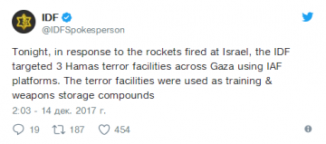 14 декабря. Израиль нанес удары по трем принадлежащим движению ХАМАС целям в секторе Газа в ответ на ракетные обстрелы территории еврейского государства. Об этом в четверг сообщила газета The Times of Israel со ссылкой на представителя Армии обороны Израиля.