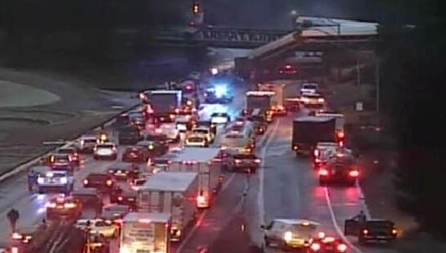 На фотографии, которую транспортные власти округа Пьерс разместили в Twitter, видно, что с путей сошел последний вагон состава. Он рухнул на шоссе, движение по нему частично остановлено.