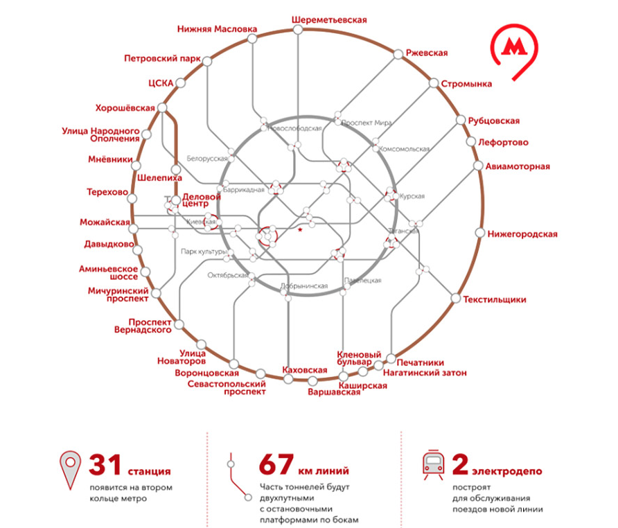 На Большой кольцевой линии будет 31 станция. Предполагаемая загруженность — до 380 млн пассажиров в год. Источник