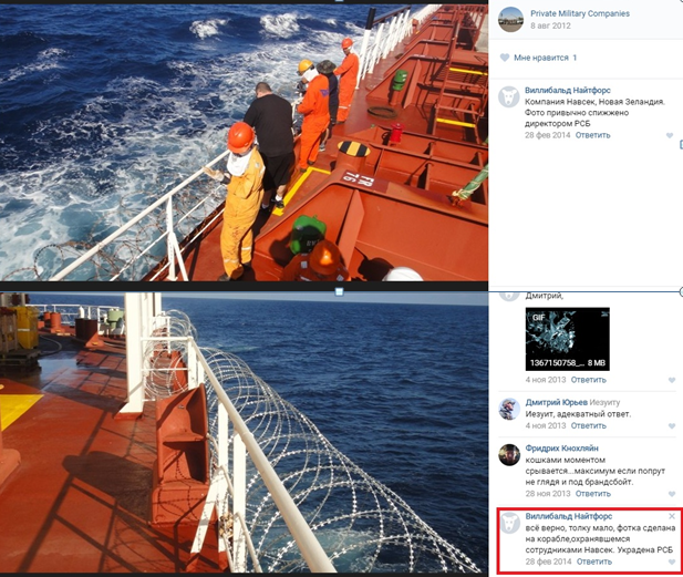 Помимо сочинительства, Криницын также увлекается воровством контента. Чтобы максимально героизировать своих бойцов, глава ЧОПа берет без спроса фотографии заграничных охранных предприятий, выдавая их за деятельность «РСБ». Пользователи «вконтакте» ещё в 2014 году заметили фотографии «Britam Defence» (Великобритания), «NavSEC» (Новая Зеландия), «HydroSEC» (США) на официальном сайте «РСБ». Описание, разумеется, повествовало об успехах ЧОПа Криницына.