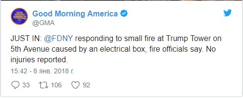 «Пожар [произошел] в многоквартирном доме [Trump Tower] в системе вентиляции», – говорится в сообщении пожарной службы в Twitter.