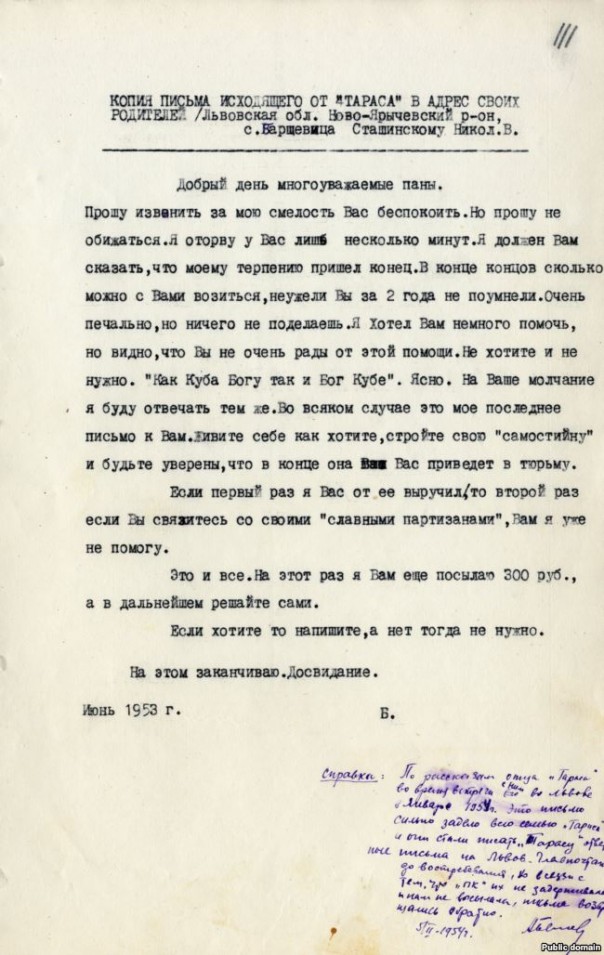 МГБ отслеживает и личную переписку «Тараса». Так, из писем Богдана Сташинского к родителям видно, что он убеждает их не поддерживать «самостийну» и подполье. Иначе, как пишет Сташинский, он уже второй раз не сможет спасти родных от «тюрьмы».
