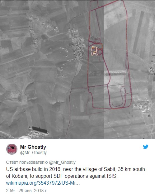 "Американская авиабаза построена в 2016 году недалеко от деревни Сабит, в 35 км к югу от Кобани, для поддержки операций Демократических сил Сирии против ИГ*", — поделился наблюдением Mr Ghostly.