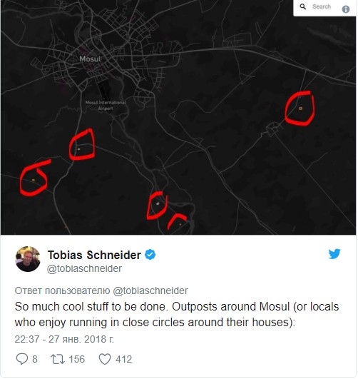 "Вот посты вокруг Мосула. (или это местные жители, которые бегают кругами вокруг своих домов)", — иронизирует Tobias Schneider.
