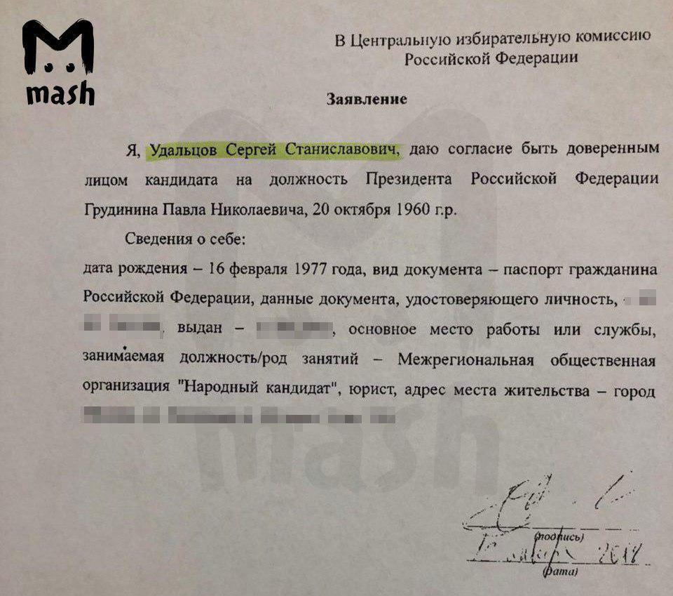 В соцсетях опубликовали заявление лидера «Левого Фронта» Сергея Удальцова о том, что он дает согласие «быть доверенным лицом кандидата на должность президента РФ» Павла Грудинина. Авторы анонимного телеграм-канала «Mash» выложили копию документа, и прокомментировали: