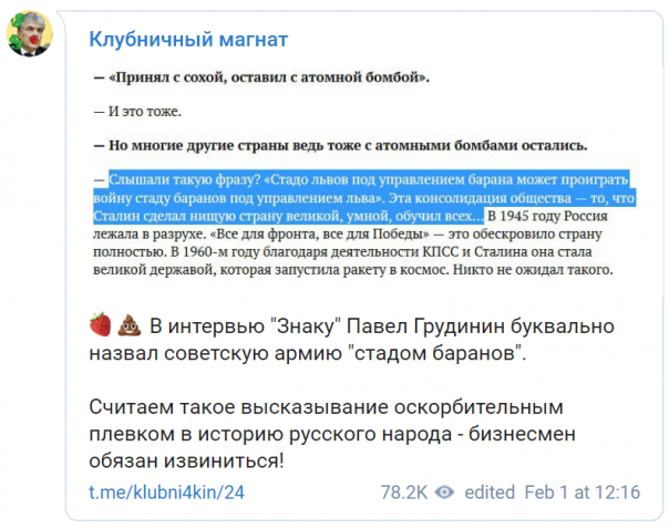 — Я настроен очень решительно, и это дело я так не оставлю. Я каждый год хожу на акцию "Бессмертного полка" с портретами моих родных — отца и других участников войны. Я готов встретиться с Грудининым, если он такое сказал, и я готов встретиться с этим екатеринбургским агентством — у них ведь кто-то проверяет новости перед публикацией?! И я готов, грубо говоря, с ними разобраться по-мужски, — подытожил Зураб Отрешко. Источник