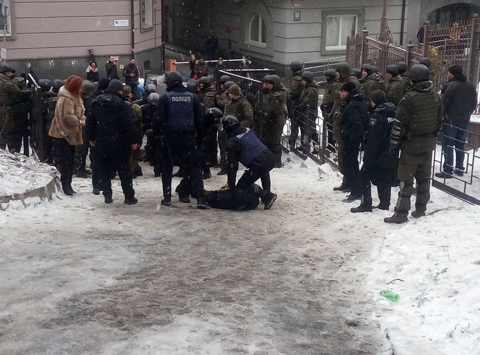 Из здания суда начали выходить неизвестные, которые вступили в конфликт с националистами. Им пыталась помешать полиция, после чего и последовали задержания. Боевики батальона «Донбасс» начали драку с правоохранителями с требованием отдать их представителей. Прозвучали два хлопка.
