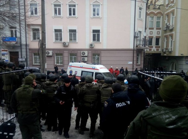 Под зданием Соломенского райсуда в Киеве, где слушается дело об избрании меры пресечения мэру Одессы Геннадию Труханову, произошла стычка националистических боевиков с нацгвардейцами, охраняюшими суд.