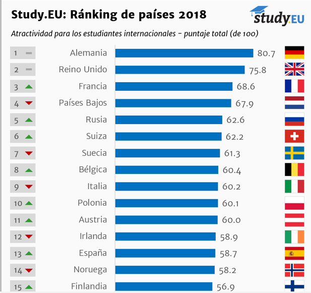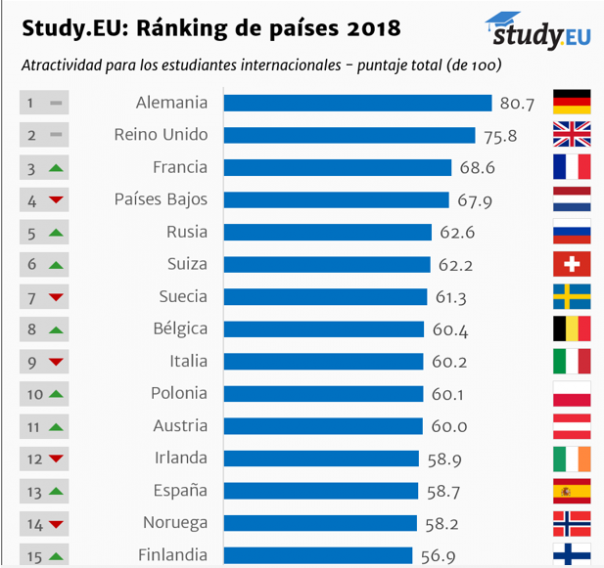 Франция заняла третье место, Нидерланды – четвертое, потом уже и Россия вошла в пятерку «лидеров». Всего в рейтинг включили тридцать европейских стран, учитывая такие факторы как стоимость жизни, образование и какие у студентов имеются перспективы после получения диплома. Россия неплохо себя показала, чему в немалой степени способствовала грамотная образовательная политика, проводимая российским руководством.