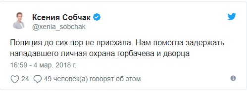 «Толкнул — я упала, облил чем-то с криком "Это за Жириновского!"», — написала Собчак, добавив, что на место вызвали полицию.