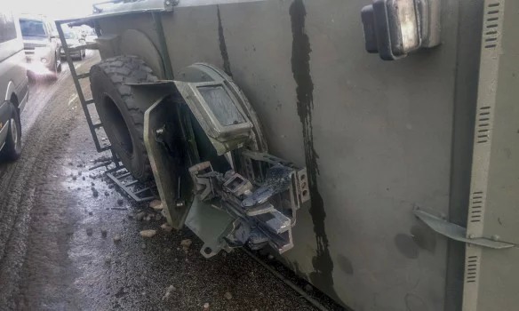 Как сообщает 112.ua, Cougar двигался в направлении станции метро "Святошин" во второй полосе. Его подрезал легковой автомобиль (партизанен?), в результате чего бронемашина вылетела на обочину и перевернулась.