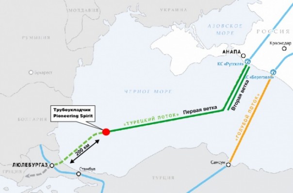 «6 марта завершилась укладка 50% морского участка газопровода „Турецкий поток“. На сегодняшний день уложено более 930 км газопровода в Черном море суммарно по двум ниткам. Судно PioneeringSpirit, осуществляющее глубоководную укладку „Турецкого потока“, прошло в первой половине дня контрольную точку 706 километр первой нитки газопровода. По второй нитке 224 км газопровода были построены в 2017 году», —сообщили в South Stream Transport B.V.
