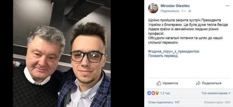 Пикантности состоявшейся встрече добавляет даже не то обстоятельство, что Петр Порошенко лично раздает указания платным блогерам из пула президентской алминистрации, как правильно освещать события текущей политики, а то, что он публично обнимается и фотографируется с человеком, который, по утверждению украинских медийщиков, является администратором одиозного стукаческого сайта “Миротворец”. Так, известный блогер Максим Равреба называет Мирослава Олешко “админом “Миротворца”.