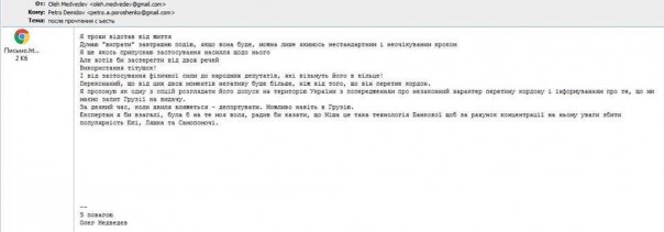 Я предлагаю как одну из опций рассматривать его допуск на территорию Украины с предупреждением о незаконном характере пересечения границы и информированием о том, что мы имеем запрос Грузии на выдачу. Через некоторое время, когда волна уляжется – депортировать. Можно даже в Грузию. Экспертам я бы вообще, была бы на то моя воля, советовал бы говорить, что Миша – это такая технология Банковой, чтобы за счет концентрации на этом внимания сбить популярность Юли, Ляшко и Самопомощи», – пишет Медведев своему шефу. Источник