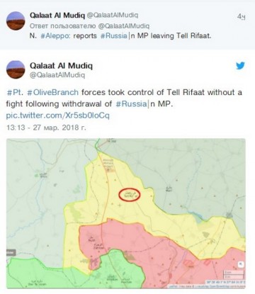 Вероятно, между Москвой и Анкарой имеются тайные договоренности, так как описанные ниже события подтверждают данную версию. Сегодня утром подразделение военной полиции Минобороны РФ, которое размещалось на базе в городе Таль Рифаат, контролируя соблюдение режима прекращения огня, без объяснения причин, покинуло населенный пункт.