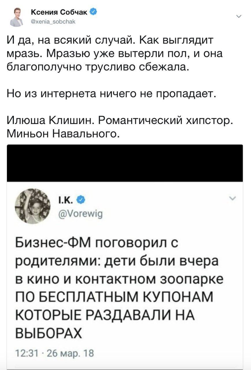 Вокруг пожара в ТЦ «Зимняя вишня» скопилось немало слухов и фейков. Одним из тех, кто старался разжечь огонь дезинформации, оказался Илья Клишин – диджитал-директор канала RTVI, при этом являющийся ярым сторонником блогера Алексея Навального. Он попытался распространить по социальным сетям информацию о том, что жертвы трагедии в Кемерово в этот день посещали контактный зоопарк и кинотеатр якобы по подарочным билетам, выданным на избирательных участках в ходе недавних президентских выборов. Вброс оперативно разоблачила телеведущая Ксения Собчак, назвавшая Клишина «мразью», которой «вытерли пол». «Миньон Навального», осознав свой провал, трусливо удалил свой пост.