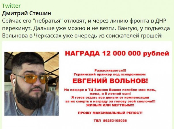 Известный российский журналист Дмитрий Стешин опубликовал на своей страничке в Твиттер сообщение о награде в 12 миллионов рублей “за голову” украинского пранкера Евгения Вольнова, получившего скандальную известность алармистским розыгрышем во время трагедии в Кемерово – с обзвоном больниц и вбросом слухов о значительно большем количестве жертв, чем это имело место в реальности.