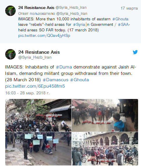 Впрочем, на фоне этой информации час назад (15:00 мск) пресс-служба «Джейш аль-Ислам» опровергла заключение сделки. Представитель группировки Хамза Биракдар заявил, что вооруженное крыло организации выступает против идеи эвакуации из Думы. В то же время он не отрицает возможное соглашение, которое могло быть подписано недавно.