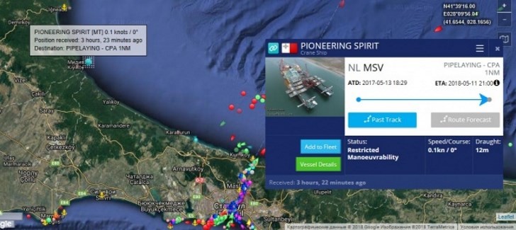 Судно Pioneering spirit, которое укладывает «Турецкий поток», уже видно с турецкого берега. По данным навигационного портала Marinetraffic, днем 28 апреля оно находилось в менее чем шести километрах от берега — турецкого населенного пункта Кыйыкей.