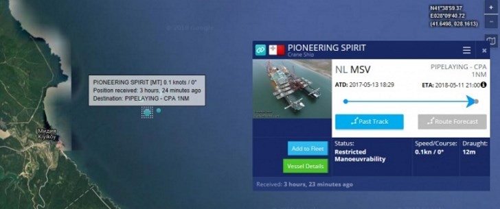 Около крупнейшего в мире трубоукладчика швейцарской компании Allseas находится сейчас судно снабжения Siem Spearfish, которое, по данным Marinetraffic, ведет подводные работы. Так же у Pioneering spirit дежурят еще одно судно снабжения, VOS Prince, и буксир.