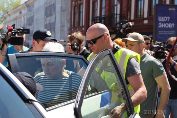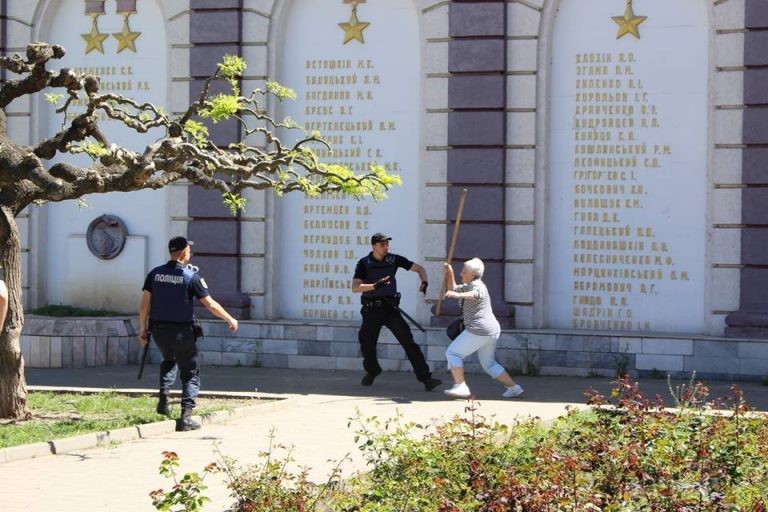 Так, в Одессе пожилая женщина вступила в конфликт с радикалами, напавшими на первомайскую демонстрацию, после чего ее задержали полицейские, от которых пенсионерке пришлось отбиваться древком от флага.