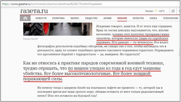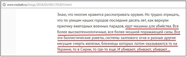 Удивительное совпадение по смыслу и оборотам, не правда ли?! Русское железо якобы смертоносно и угрожает всему миру. Да, если б не русское оружие в руках советских солдат, Волошина вообще не появилась бы на свет. Фантастическое лицемерие журналистки, ведь западное оружие исключительно спасает детей и котят.