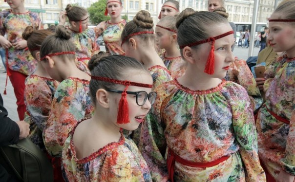 Колонна, в которую согнали студентов вузов, в том числе из стран Азии и Африки, прошла от площади Конституции до театра оперы и балета имени Лысенко. В руках люди несли флаги Украины, букеты, транспаранты, звучали украинские народные песни.