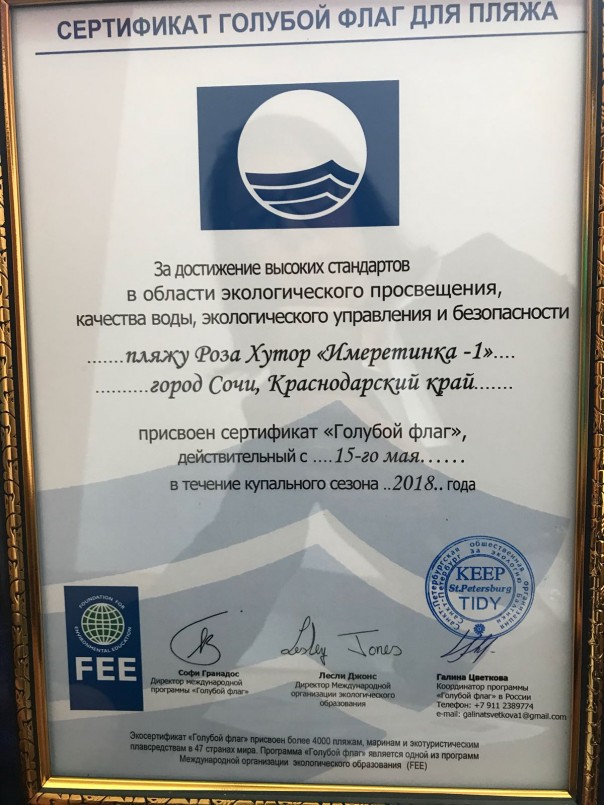 Пляж курорта «Роза Хутор» в Имеретинской долине удостоен экологического сертификата качества – Голубого флага. Это специальная награда международной Федерации экологического образования / Foundation for Environmental Education (FEE), которым она с 1987 года отмечает пляжи и причалы, отвечающие самым высоким требованиям.