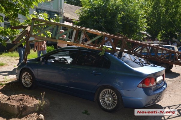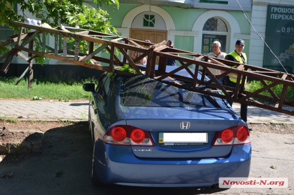 Один из столбов упал на автомобиль Honda Civic, припаркованный на Потемкинской. На месте уже работают полицейские – правда, кто возместит владельцу покореженной машины ущерб, не понятно.