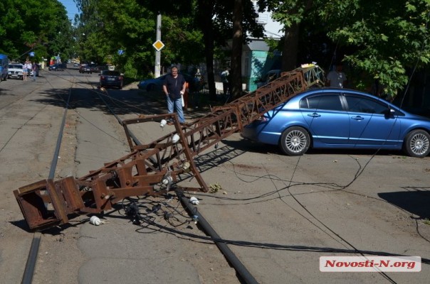 В центре Николаева рухнули электроопоры: повреждена машина, улица перекрыта