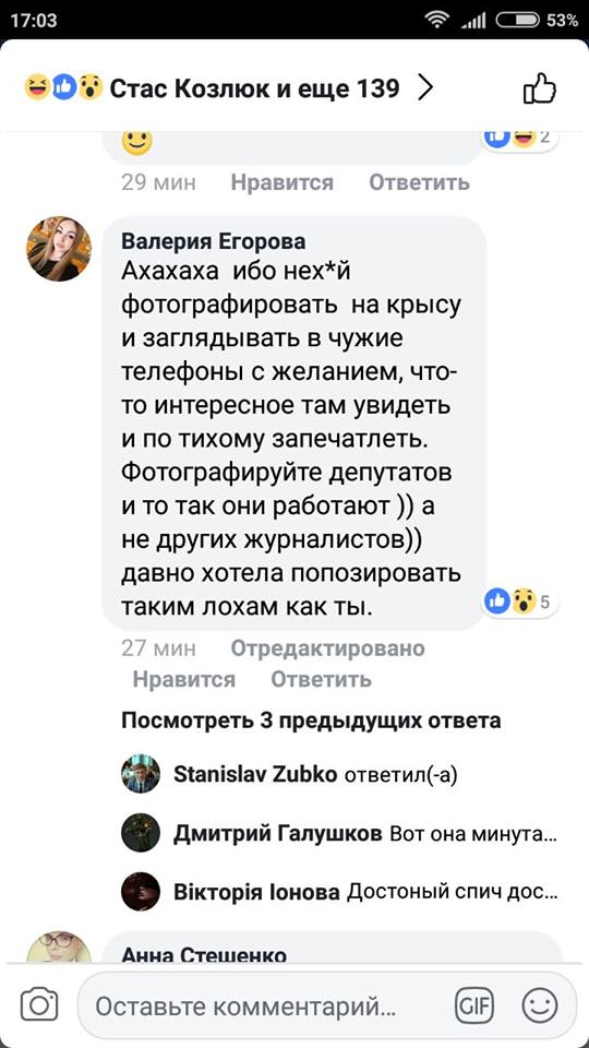 «Ни текстов, ни интервью, ни новостей у этих «дам» явно нет и не будет никогда. А из-за такого контингента, уважение к нам также падает. По простой аналогии. Развелось просто в Раде разной швали», – возмущается парламентский журналист Анна Стешенко.